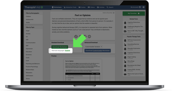 To find worksheets of a particular language, visit our search page and search for your desired language, plus whatever topic you're interested in (e.g., "Spanish CBT worksheets").